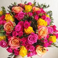 Яркий букет из одноголовых и кустовых роз подарит положительные эмоции и заряд позитивной энергией. Желтые розы на языке цветов означают улыбку, радость и веселье, а розовые – искренность и надежду на развитие, успешность отношений. Писташ добавлена для органичности композиции, что получилось, букет смотрится впечатляюще, подходит любимой женщине и членам семьи.